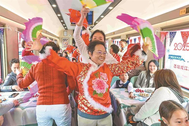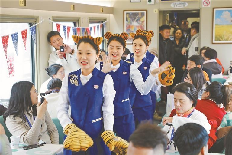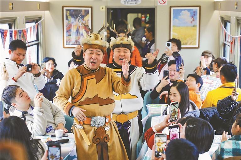 2月5日18時(shí)20分,K7041次“東北大花”主題列車從哈爾濱站緩緩駛出,一路向北,駛向漠河。車廂內(nèi),來自大興安嶺的鄂倫春族非遺代表性傳承人,現(xiàn)場展示用樺樹皮制作的手工藝品,列車工作人員身著民俗服飾帶領(lǐng)游客剪窗花,東北秧歌、二人轉(zhuǎn)表演更是點(diǎn)燃了旅途熱情。